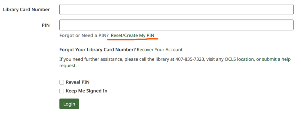 1. To set your PIN, go to “SIGN IN” or “Your Account” at catalog.ocls.org and select the “Reset/Create My PIN” link.