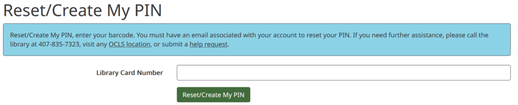 2. Enter your library card number and select the Reset/Create My PIN button.